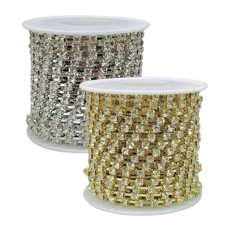 A Corrente de Strass de 4mm é o toque de brilho e sofisticação que suas criações precisam. Com cristais reluzentes dispostos de forma elegante, essa corrente é ideal para dar um acabamento luxuoso a roupas, acessórios, bijuterias e projetos de decoração.