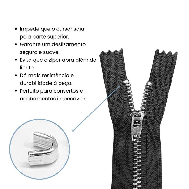 O Terminal Superior para Zíper N3 é o acessório ideal para dar um acabamento impecável aos seus projetos de costura. Feito com material resistente e de alta qualidade, ele garante que o cursor não ultrapasse o final do trilho, proporcionando segurança e um visual profissional para bolsas, necessaires, roupas e muito mais!